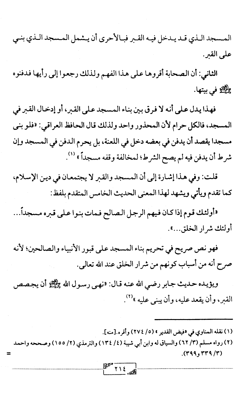 ويؤيده حديث جابر رضي الله عنه قال: «نهى رسول الله - صلى الله عليه وآله وسلم - أن يجصص القبر، وأن يقعد عليه، وأن يبنى عليه» (¬2).
