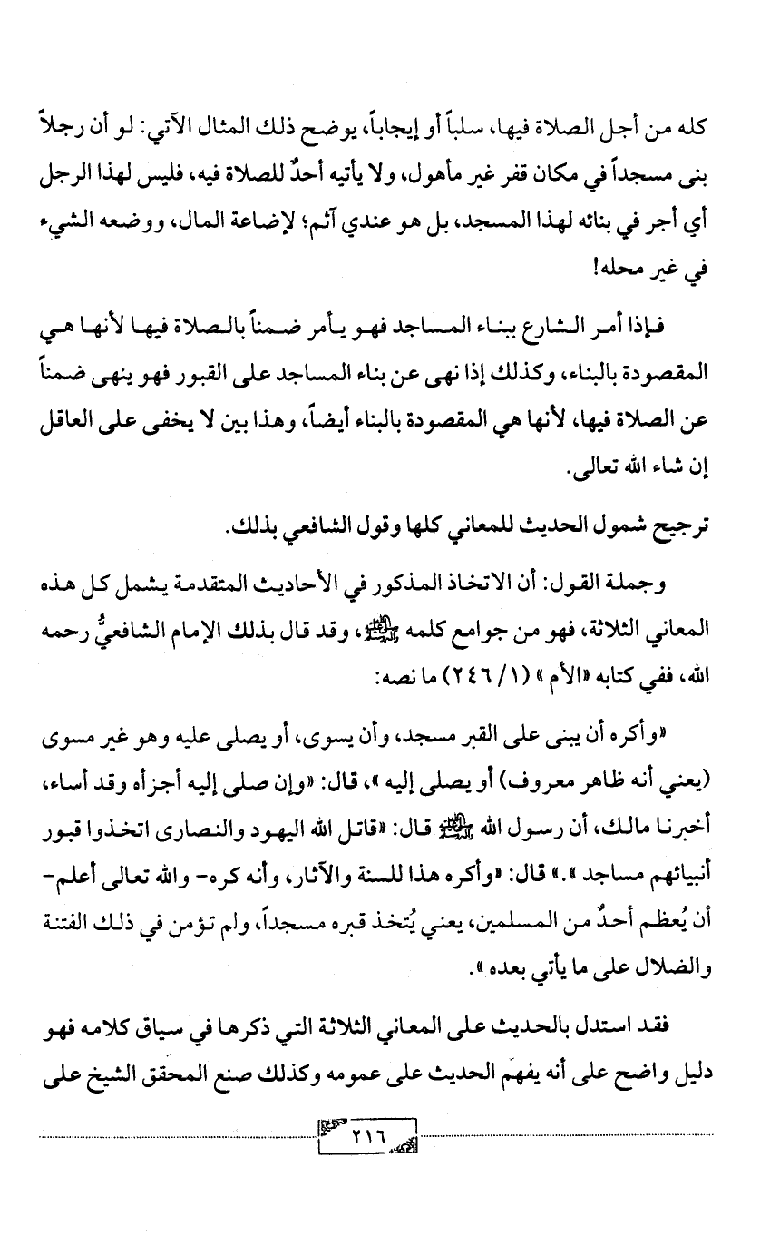 فإذا أمر الشارع ببناء المساجد فهو يأمر ضمناً بالصلاة فيها لأنها هي المقصودة بالبناء، وكذلك إذا نهى عن بناء المساجد على القبور فهو ينهى ضمناً عن الصلاة فيها، لأنها هي المقصودة بالبناء أيضاً، وهذا بين لا يخفى على العاقل إن شاء الله تعالى.