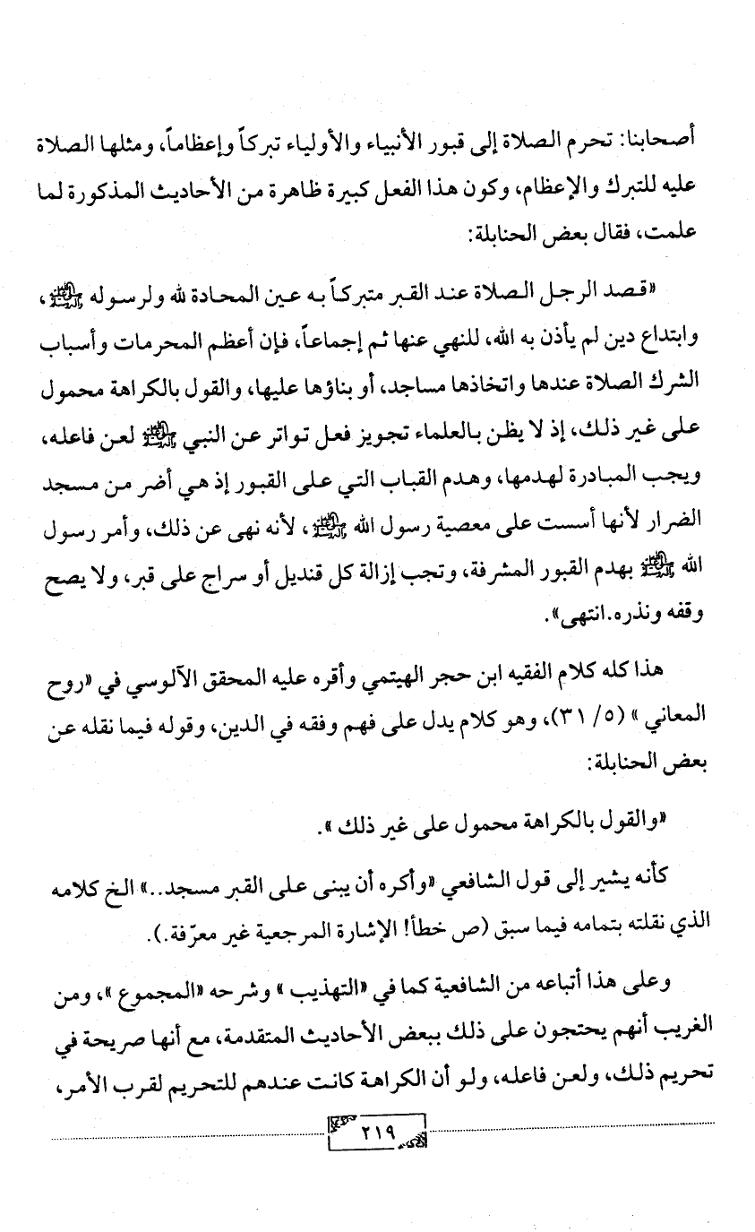 «قصد الرجل الصلاة عند القبر متبركاً به عين المحادة لله ولرسوله - صلى الله عليه وآله وسلم -، وابتداع دين لم يأذن به الله، للنهي عنها ثم إجماعاً، فإن أعظم المحرمات وأسباب الشرك الصلاة عندها واتخاذها مساجد، أو بناؤها عليها، والقول بالكراهة محمول على غير ذلك، إذ لا يظن بالعلماء تجويز فعل تواتر عن النبي - صلى الله عليه وآله وسلم - لعن فاعله، ويجب المبادرة لهدمها، وهدم القباب التي على القبور إذ هي أضر من مسجد الضرار لأنها أسست على معصية رسول الله - صلى الله عليه وآله وسلم -، لأنه نهى عن ذلك، وأمر رسول الله - صلى الله عليه وآله وسلم - بهدم القبور المشرفة، وتجب إزالة كل قنديل أو سراج على قبر، ولا يصح وقفه ونذره. انتهى».