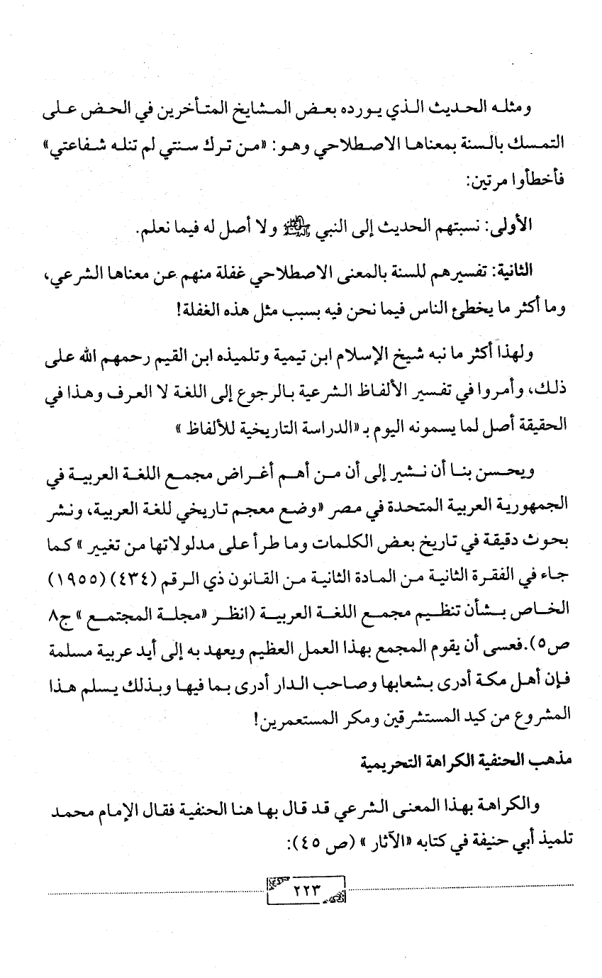 ومثله الحديث الذي يورده بعض المشايخ المتأخرين في الحض على التمسك بالسنة بمعناها الاصطلاحي وهو: «من ترك سنتي لم تنله شفاعتي» فأخطأوا مرتين: