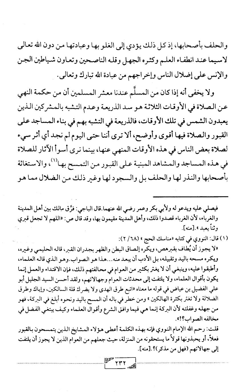 ولا يخفى أنه إذا كان من المسلَّم عندنا معشر المسلمين أن من حكمة النهي عن الصلاة في الأوقات الثلاثة هو سد الذريعة وعدم التشبه بالمشركين الذين يعبدون الشمس في تلك الأوقات، فالذريعة في التشبه بهم في بناء المساجد على القبور والصلاة فيها أقوى وأوضح، ألا ترى أننا حتى اليوم لم نجد أي أثر سيء لصلاة بعض الناس في هذه الأوقات المنهي عنها، بينما نرى أسوأ الآثار للصلاة في هذه المساجد والمشاهد المبنية على القبور من التمسح بها (¬1)،