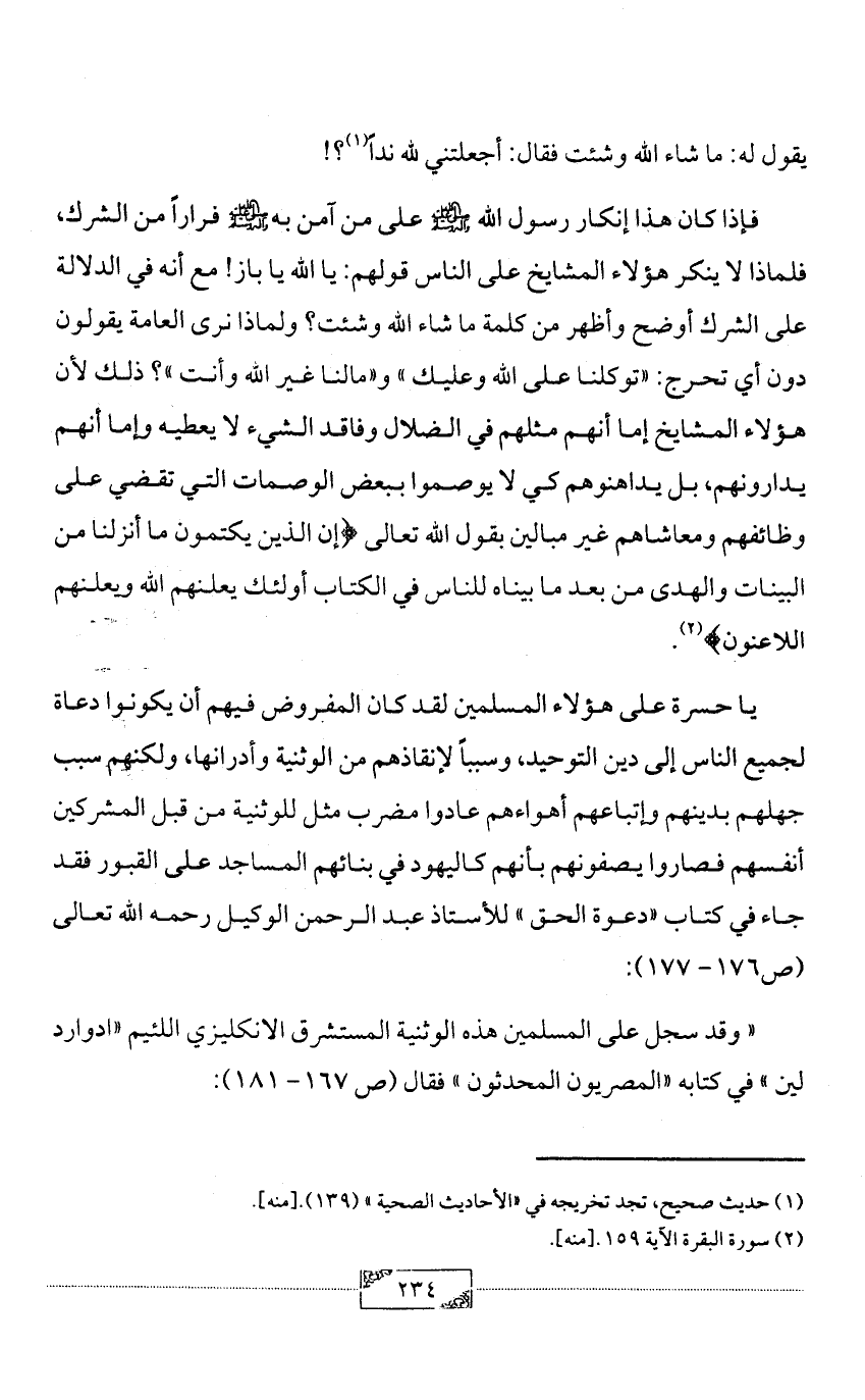 «وقد سجل على المسلمين هذه الوثنية المستشرق الانكليزي اللئيم «ادوارد لين» في كتابه «المصريون المحدثون» فقال (ص 167 - 181):