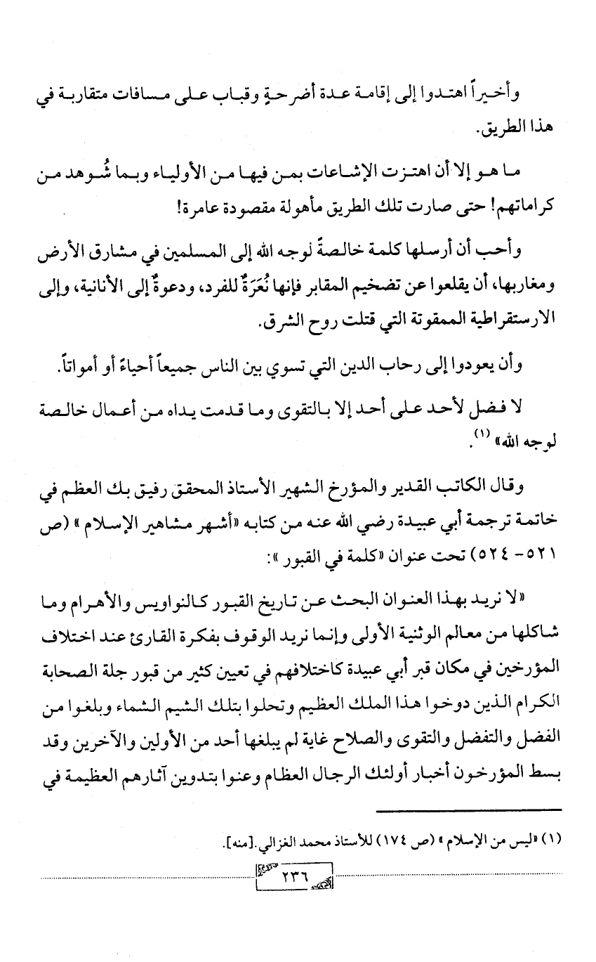 وأحب أن أرسلها كلمة خالصةً لوجه الله إلى المسلمين في مشارق الأرض ومغاربها، أن يقلعوا عن تضخيم المقابر فإنها نُعَرَةٌ للفرد، ودعوةٌ إلى الأنانية، وإلى الارستقراطية الممقوتة التي قتلت روح الشرق.