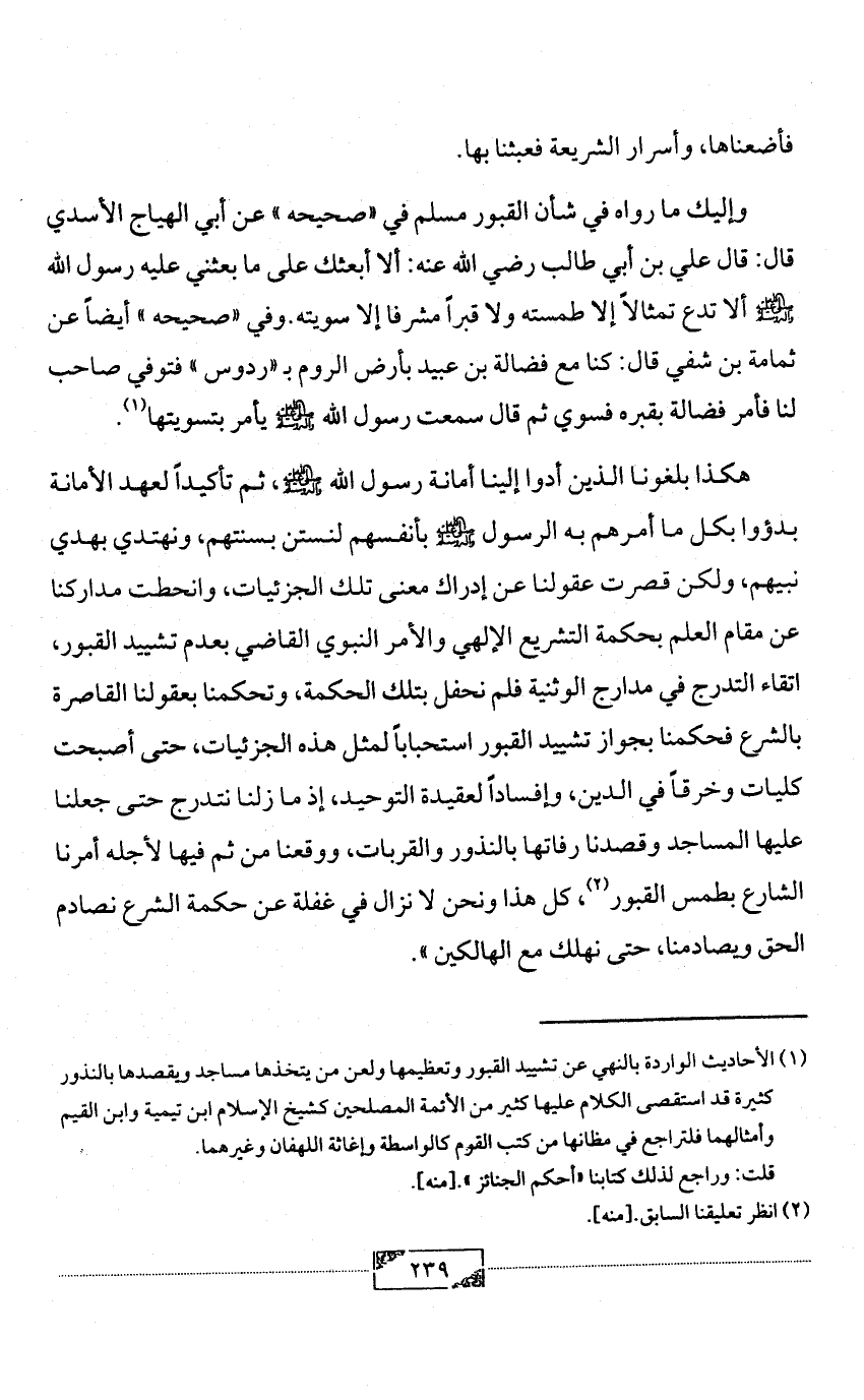 وإليك ما رواه في شأن القبور مسلم في «صحيحه» عن أبي الهياج الأسدي قال: قال علي بن أبي طالب رضي الله عنه: ألا أبعثك على ما بعثني عليه رسول الله - صلى الله عليه وآله وسلم - ألا تدع تمثالاً إلا طمسته ولا قبراً مشرفا إلا سويته. وفي «صحيحه» أيضاً عن ثمامة بن شفي قال: كنا مع فضالة بن عبيد بأرض الروم بـ «ردوس» فتوفي صاحب لنا فأمر فضالة بقبره فسوي ثم قال سمعت رسول الله - صلى الله عليه وآله وسلم - يأمر بتسويتها (¬1).