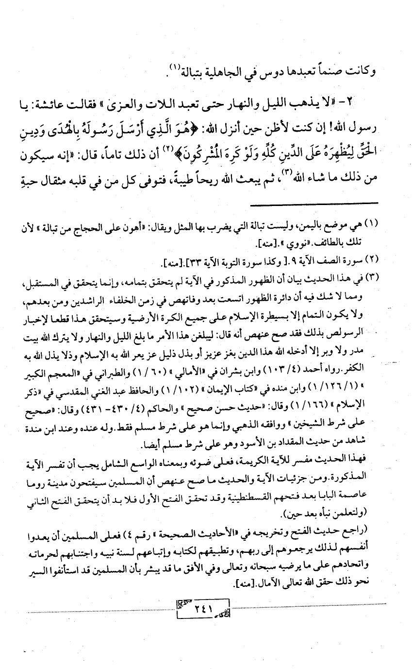 (¬3) في هذا الحديث بيان أن الظهور المذكور في الآية لم يتحقق بتمامه، وإنما يتحقق في المستقبل، ومما لا شك فيه أن دائرة الظهور اتسعت بعد وفاتهص في زمن الخلفاء الراشدين ومن بعدهم، ولا يكون التمام إلا بسيطرة الإسلام على جميع الكرة الأرضية وسيتحقق هذا قطعا لإخبار الرسولص بذلك فقد صح عنهص أنه قال: ليبلغن هذا الأمر ما بلغ الليل والنهار ولا يترك الله بيت مدر ولا وبر إلا أدخله الله هذا الدين بغز عزيز أو بذل ذليل عز يعر الله به الإسلام وذلا يذل الله به الكفر. رواه أحمد (4/ 103) وابن بشران في «الأمالي» (60/ 1) والطبراني في «المعجم الكبير» (1/ 126/1) وابن منده في «كتاب الإيمان» (102/ 1) والحافظ عبد الغني المقدسي في «ذكر الإسلام» (166/ 1) وقال: «حديث حسن صحيح» والحاكم (4/ 430 - 431) وقال: «صحيح على شرط الشيخين» ووافقه الذهبي وإنما هو على شرط مسلم فقط. وله عنده وعند ابن مندة شاهد من حديث المقداد بن الأسود وهو على شرط مسلم أيضا.