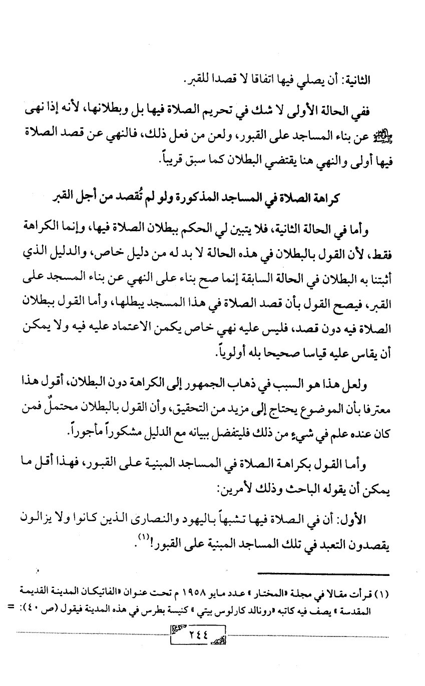 وأما في الحالة الثانية، فلا يتبين لي الحكم ببطلان الصلاة فيها، وإنما الكراهة فقط، لأن القول بالبطلان في هذه الحالة لا بد له من دليل خاص، والدليل الذي أثبتنا به البطلان في الحالة السابقة إنما صح بناء على النهي عن بناء المسجد على القبر، فيصح القول بأن قصد الصلاة في هذا المسجد يبطلها، وأما القول ببطلان الصلاة فيه دون قصد، فليس عليه نهي خاص يكمن الاعتماد عليه فيه ولا يمكن أن يقاس عليه قياسا صحيحا بله أولوياً.