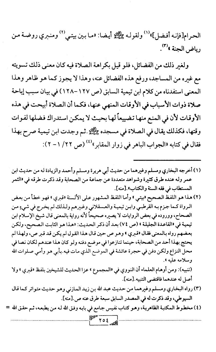 ولغير ذلك من الفضائل، فلو قيل بكراهة الصلاة فيه كان معنى ذلك تسويته مع غيره من المساجد، ورفع هذه الفضائل عنه، وهذا لا يجوز كما هو ظاهر وهذا المعنى استفدناه من كلام ابن تيمية السابق (ص 127 - 128) في بيان سبب إباحة صلاة ذوات الأسباب في الأوقات المنهي عنها، فكما أن الصلاة أبيحت في هذه الأوقات لأن في المنع منها تضييعاً لها بحيث لا يمكن استدراك فضلها لفوات وقتها، فكذلك يقال في الصلاة في مسجده - صلى الله عليه وآله وسلم -.ثم وجدت ابن تيمية صرح بهذا فقال في كتابه «الجواب الباهر في زوار المقابر» (¬4) (ص 22/ 1 - 2):