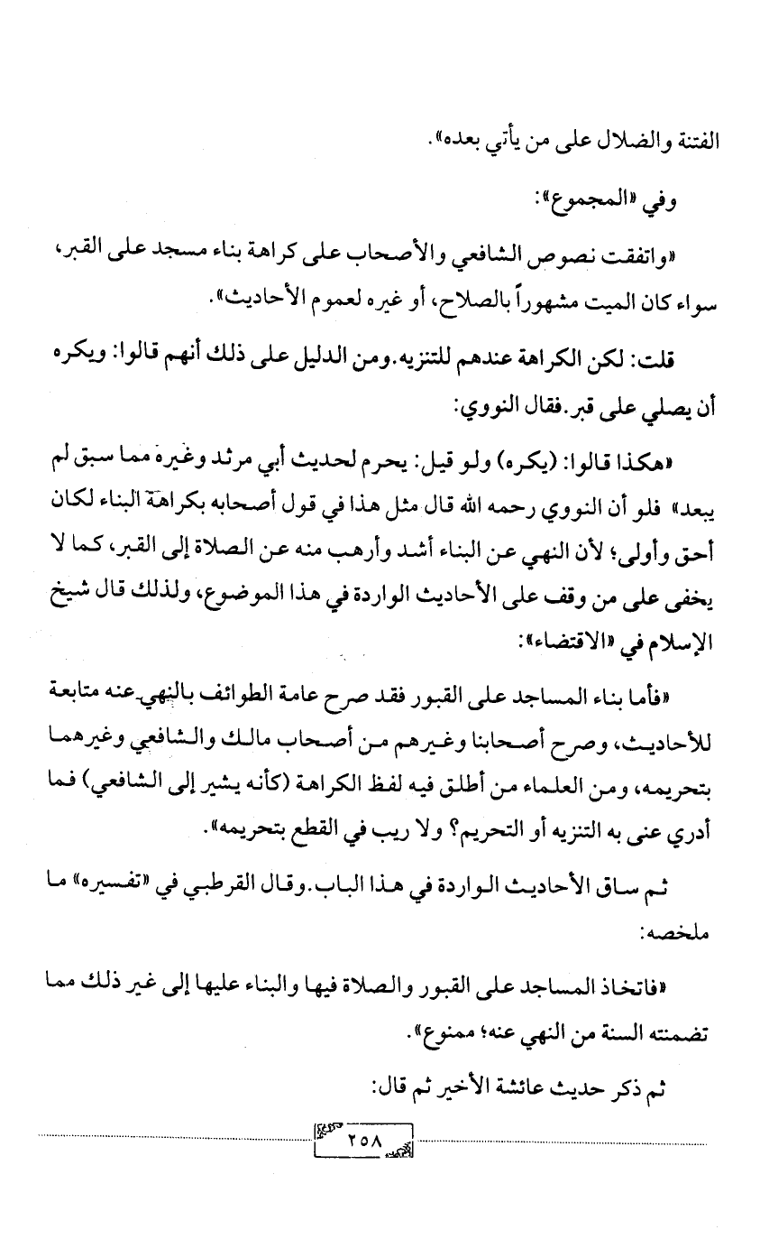 «هكذا قالوا: (يكره) ولو قيل: يحرم لحديث أبي مرثد وغيره مما سبق لم يبعد» فلو أن النووي رحمه الله قال مثل هذا في قول أصحابه بكراهة البناء لكان أحق وأولى؛ لأن النهي عن البناء أشد وأرهب منه عن الصلاة إلى القبر، كما لا يخفى على من وقف على الأحاديث الواردة في هذا الموضوع، ولذلك قال شيخ الإسلام في «الاقتضاء»: