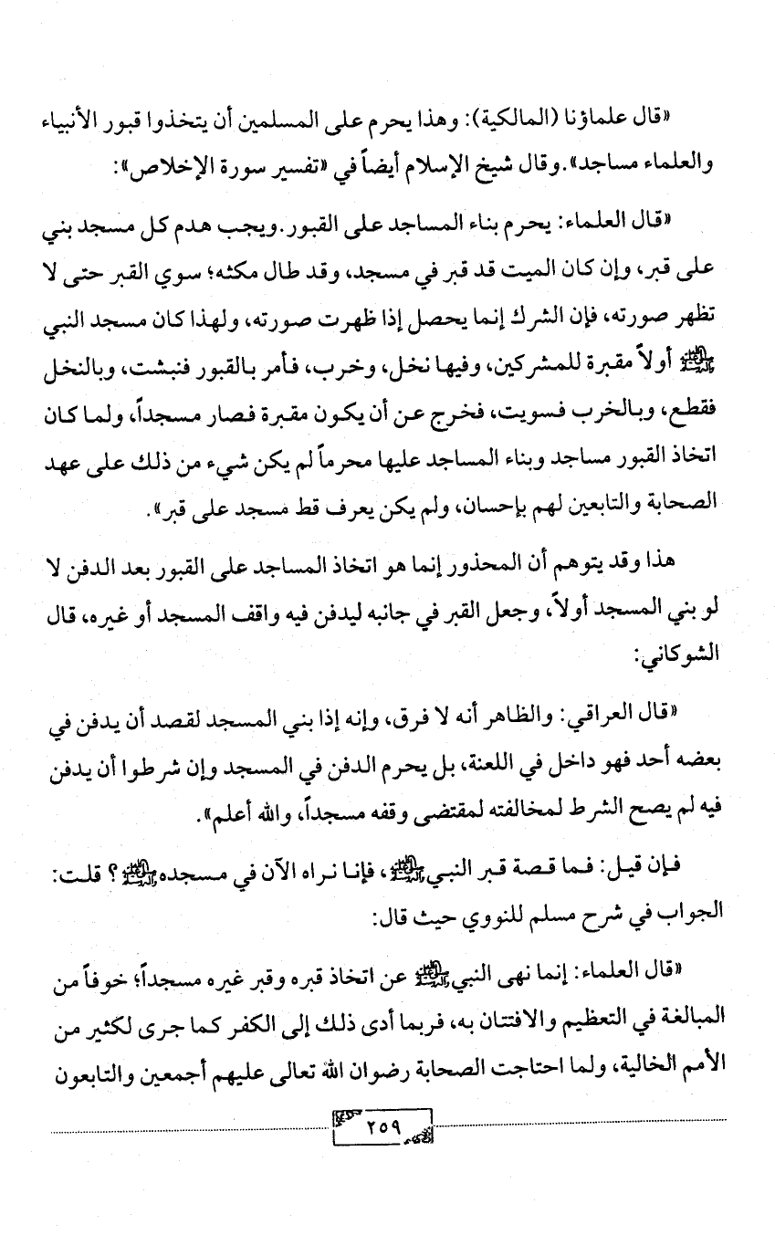 «قال علماؤنا (المالكية): وهذا يحرم على المسلمين أن يتخذوا قبور الأنبياء والعلماء مساجد».وقال شيخ الإسلام أيضاً في «تفسير سورة الإخلاص»: