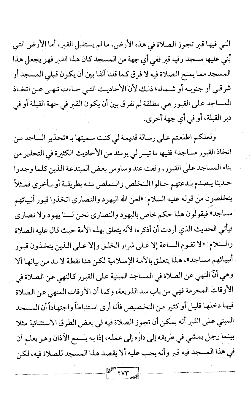 ولعلكم اطلعتم على رسالة قديمة لي كنت سميتها بـ «تحذير الساجد من اتخاذ القبور مساجد» ففيها ما تيسر لي يومئذ من الأحاديث الكثيرة في التحذير من بناء المساجد على القبور، وقفت عند وساوس بعض المبتدعة الذين كلما وجدوا حديثا يصدم بدعتهم حالوا التخلص والتملص منه بطريقة أو بأخرى فمثلاً يتخلصون من قوله عليه السلام: «لعن الله اليهود والنصارى اتخذوا قبور أنبيائهم مساجد» فيقولون هذا حكم خاص باليهود والنصارى نحن لسنا يهود ولا نصارى فيأتي الحديث الذي أردت أن أذكره؛ لأنه يتعلق بهذه الأمة حيث قال عليه الصلاة والسلام: «لا تقوم الساعة إلا على شرار الخلق وإلا على الذين يتخذون قبور أنبيائهم مساجد»، هذا يتعلق بالأمة الإسلامية لكن هنا نقطة لا بد من بيانها ألا وهي أن النهي عن الصلاة في المساجد المبنية على القبور كالنهي عن الصلاة في الأوقات المحرمة فهي من باب سد الذريعة، وكما أن الأوقات المنهي عن الصلاة فيها دخلها قليل أو كثير من التخصيص فأنا أرى استنباطاً واجتهاداً أن المسجد المبني على القبر أنه يمكن أن تجوز الصلاة فيه في بعض الطرق الاستثنائية مثلا بينما رجل يمشي في طريقه إلى داره إلى عمله، إذا به يسمع الآذان وهو يعلم أن في هذا المسجد فيه قبر وأنه يجب عليه ألا يقصد هذا المسجد للصلاة فيه، لكن