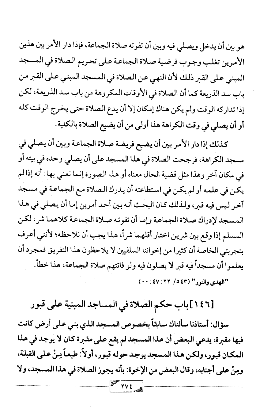 كذلك إذا دار الأمر بين أن يضيع فريضة صلاة الجماعة وبين أن يصلي في مسجد الكراهة، فرجحت الصلاة في هذا المسجد على أن يصلي وحده في بيته أو في مكان آخر وهذا مثل قضية الحال معناه أو هذا الصورة إنما نعني بها: أنه إذا لم يكن في علمه أو لم يكن في استطاعته أن يدرك الصلاة مع الجماعة في مسجد آخر ليس فيه قبر، ولذلك كان البحث أنه بين أحد أمرين إما أن يصلي في هذا المسجد لإدراك صلاة الجماعة وإما أن تفوته صلاة الجماعة كلاهما شر، لكن المسلم إذا وقع بين شرين اختار أقلهما شراً، هذا يجب أن نلاحظه؛ لأنني أعرف بتجربتي الخاصة أن كثيرا من إخواننا السلفيين لا يلاحظون هذا التفريق فمجرد أن يعلموا أن مسجداً فيه قبر لا يصلون فيه ولو فاتتهم صلاة الجماعة، هذا خطأ.