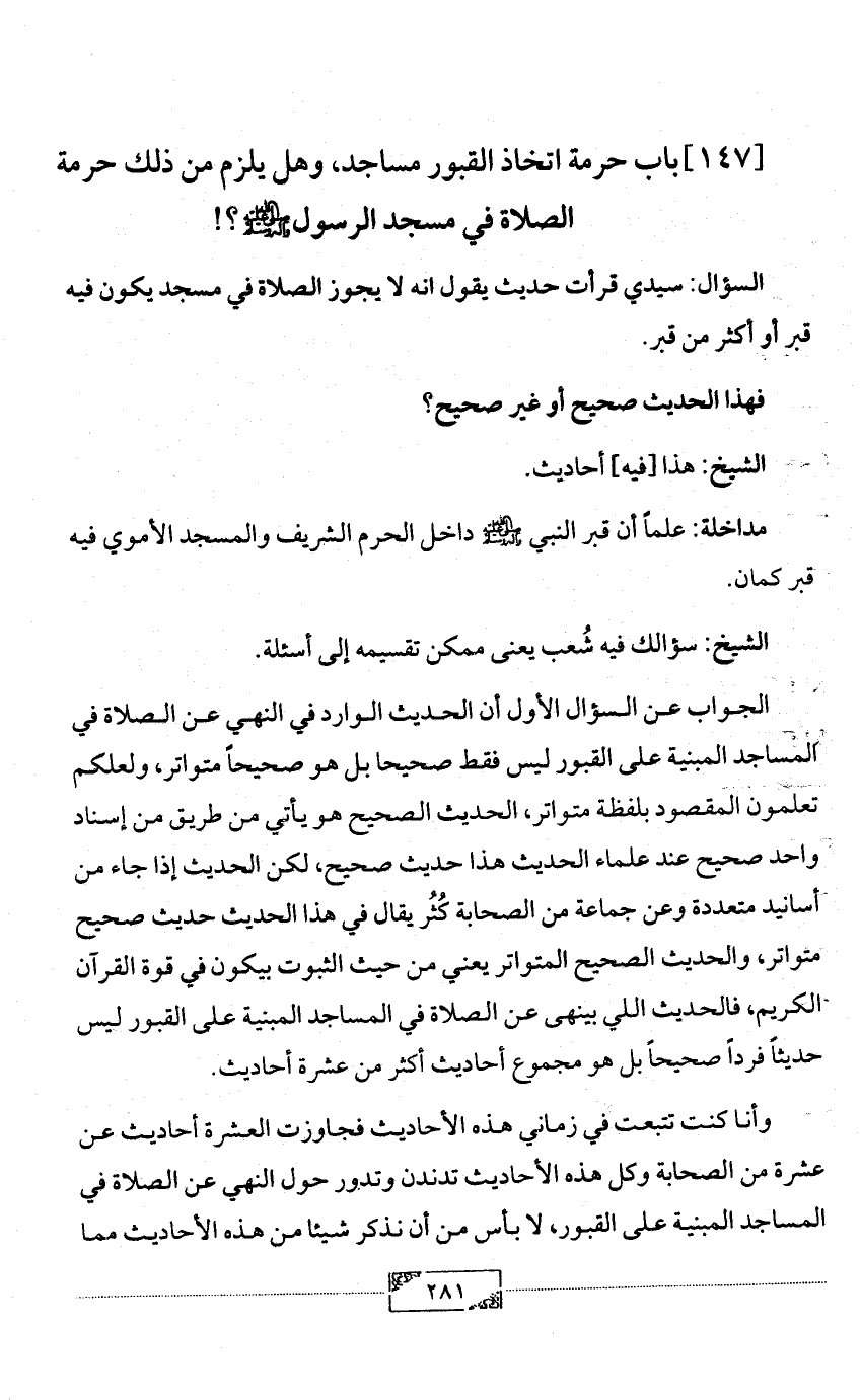 الجواب عن السؤال الأول أن الحديث الوارد في النهي عن الصلاة في المساجد المبنية على القبور ليس فقط صحيحا بل هو صحيحاً متواتر, ولعلكم تعلمون المقصود بلفظة متواتر, الحديث الصحيح هو يأتي من طريق من إسناد واحد صحيح عند علماء الحديث هذا حديث صحيح, لكن الحديث إذا جاء من أسانيد متعددة وعن جماعة من الصحابة كُثُر يقال في هذا الحديث حديث صحيح متواتر, والحديث الصحيح المتواتر يعني من حيث الثبوت بيكون في قوة القرآن الكريم, فالحديث اللي بينهى عن الصلاة في المساجد المبنية على القبور ليس حديثاً فرداً صحيحاً بل هو مجموع أحاديث أكثر من عشرة أحاديث.