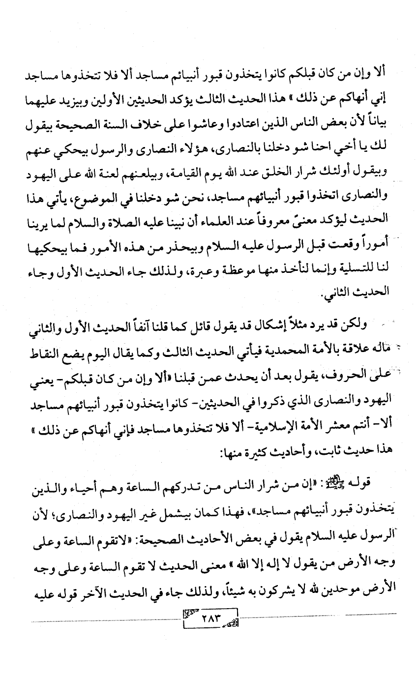 ولكن قد يرد مثلاً إشكال قد يقول قائل كما قلنا آنفاً الحديث الأول والثاني ماله علاقة بالأمة المحمدية فيأتي الحديث الثالث وكما يقال اليوم يضع النقاط على الحروف, يقول بعد أن يحدث عمن قبلنا «ألا وإن من كان قبلكم- يعني اليهود والنصارى الذي ذكروا في الحديثين- كانوا يتخذون قبور أنبيائهم مساجد ألا- أنتم معشر الأمة الإسلامية- ألا فلا تتخذوها مساجد فإني أنهاكم عن ذلك» هذا حديث ثابت, وأحاديث كثيرة منها: