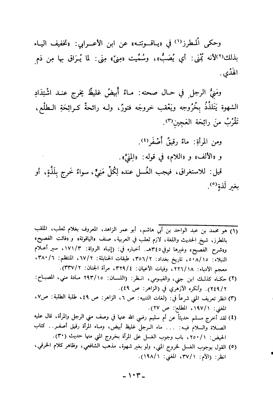 (¬3) انظر تعريف المني شرعًا في: (لغات التنبيه: ص 6، الزاهر: ص 49، طلبة الطلبة: ص 7، المغني: 1/ 197، المطلع: ص 27).