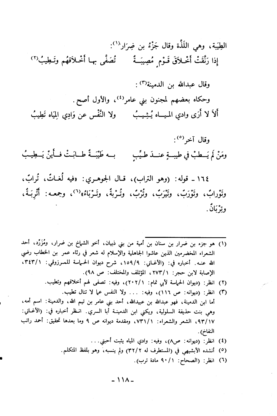 164 - قوله: (وهو التراب)، قال الجوهري: (فيه لُغاتٌ، تُرابٌ، وتَوْرابٌ، وتَوْرَبٌ، وتَيْرَبٌ، وتُرْبٌ، وتُرْبةٌ، وتَرْبَاءُ" (¬6)، وجمعه: أتْرِبَةٌ، وتِرْبَانٌ.