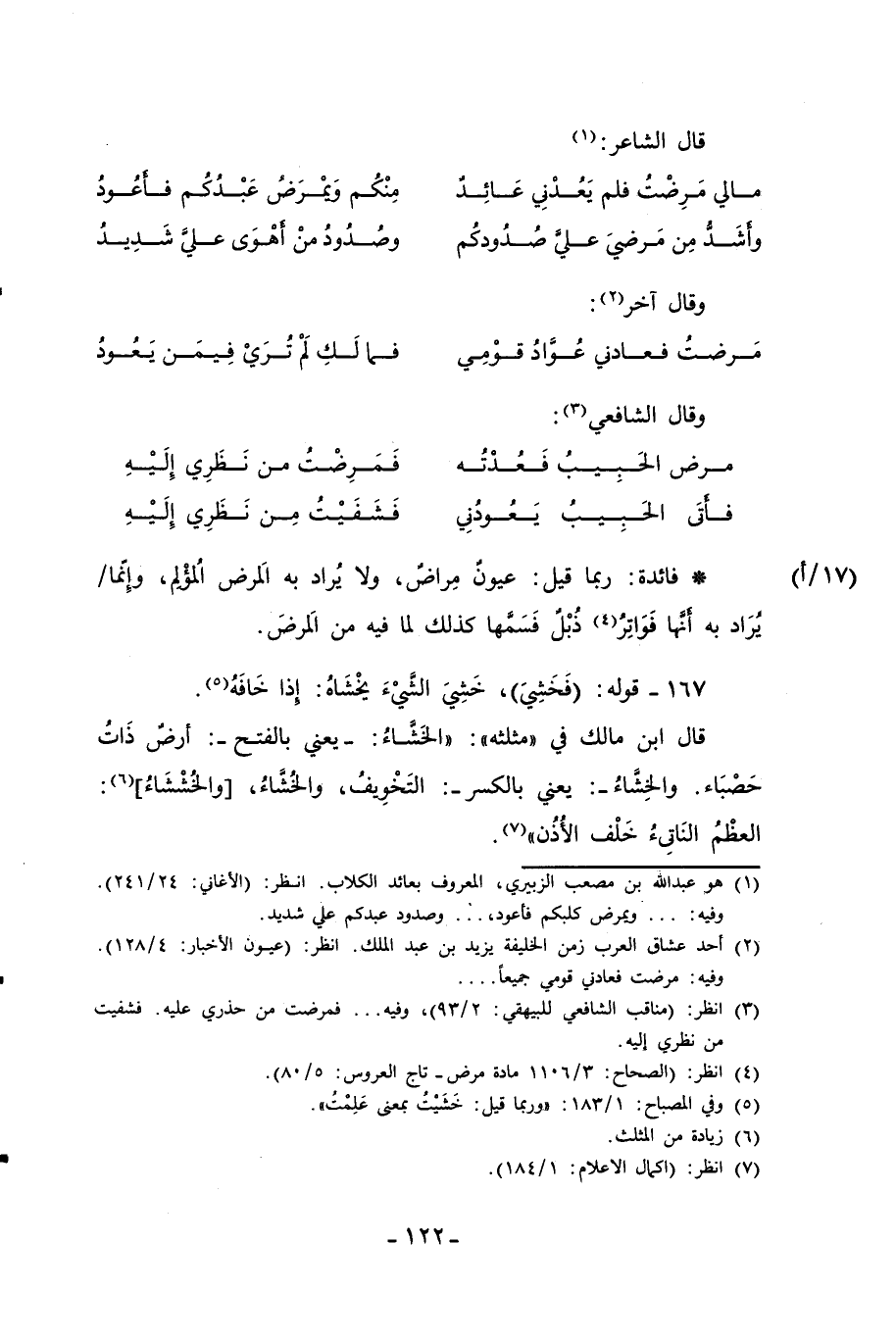 * فائدة: ربما قيل: عيونٌ مِراضٌ، ولا يُراد به الَمرض المُؤْلم، وإِنَّمْا يُرَاد به أنها فَوَاتِرُ (¬4) ذُبْلٌ فَسَمَّها كذلك لما فيه من الَمرضَ.