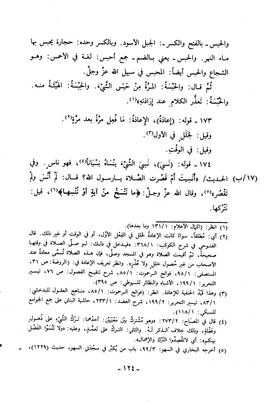 174 - قوله: (نَسيَ)، نَسِيَ الشَّيْءَ ينْسَاهُ نِسْيَانًا (¬4)، فهو ناسٍ. وفي الحديث "أَنَسِيتَ أَمْ قَصُرت الصَّلاة يا رسول الله؟ قال: لَمْ أَنْسَ ولمْ تَقْصُر" (¬5)،