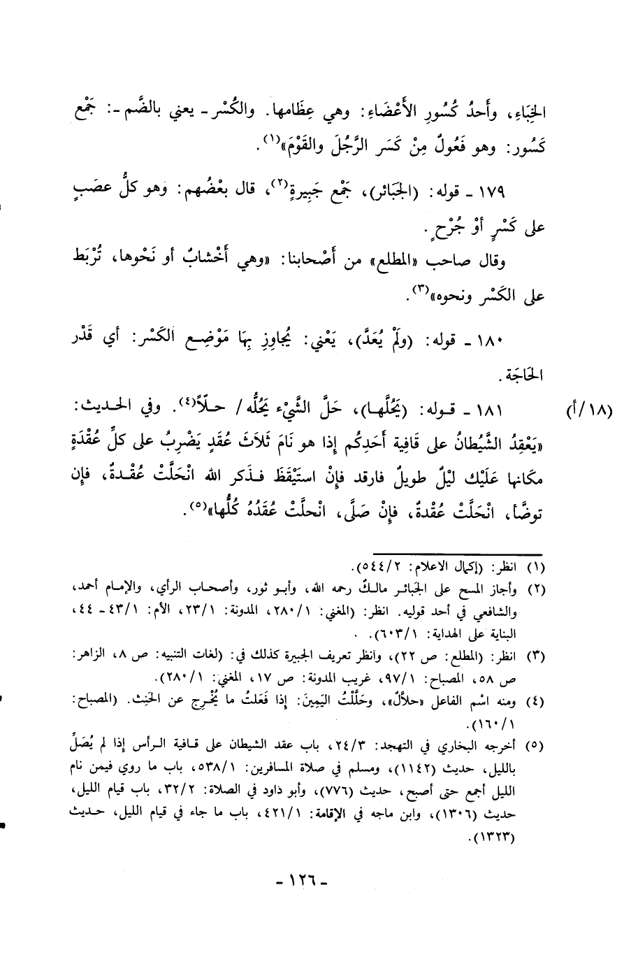 181 - قوله: (يَحُلَّها)، حَلَّ الشَّيْء يَحُلُه حلًّا (¬4). وفي الحديث: "يَعْقِدُ الشَّيُطانُ على قَافِية أَحَدِكُم إِذا هو نَامَ ثَلَاثَ عُقَدٍ يَضْرِبُ على كلِّ عُقْدَةٍ مكَانها عَلَيْك ليْلٌ طويلٌ فارقد فإنْ استَيْقَظَ فذَكر الله انْحَلَّتْ عُقْدةٌ، فإِن توضَّأ، انْحَلَّتْ عُقْدة، فإِنْ صَلَّى، انْحلَّتْ عُقَدُهُ كُلُّها" (¬5).