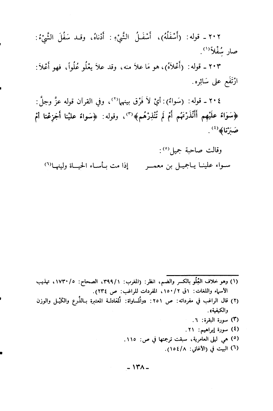 204 - قوله: (سَواءٌ): أيْ لاَ فَرْق بينهما (¬2)، وفي القرآن قوله عزَّ وجلَّ: {سَوَاءٌ عَلَيْهِمْ أَأَنْذَرْتَهُمْ أَمْ لَمْ تُنْذِرْهُمْ} (¬3)، وقوله: {سَوَاءٌ عَلَيْنَا أَجَزِعْنَا أَمْ صَبَرْنَا} (¬4).