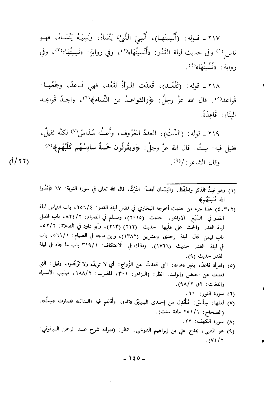217 - قوله: (أُنْسِيتَها)، أُنْسِيَ الشَّيْءَ يَنْسَاهُ، ونَسِيَهُ يَنْسَاهُ، فهو ناسٍ (¬1) وفي حديث ليلَة القَدْر: "أُنْسِيتُهَا" (¬2)، وفي روايةٍ: "نَسِيتُهَا" (¬3)، وفي رواية: "نُسِّيتُهَا" (¬4).