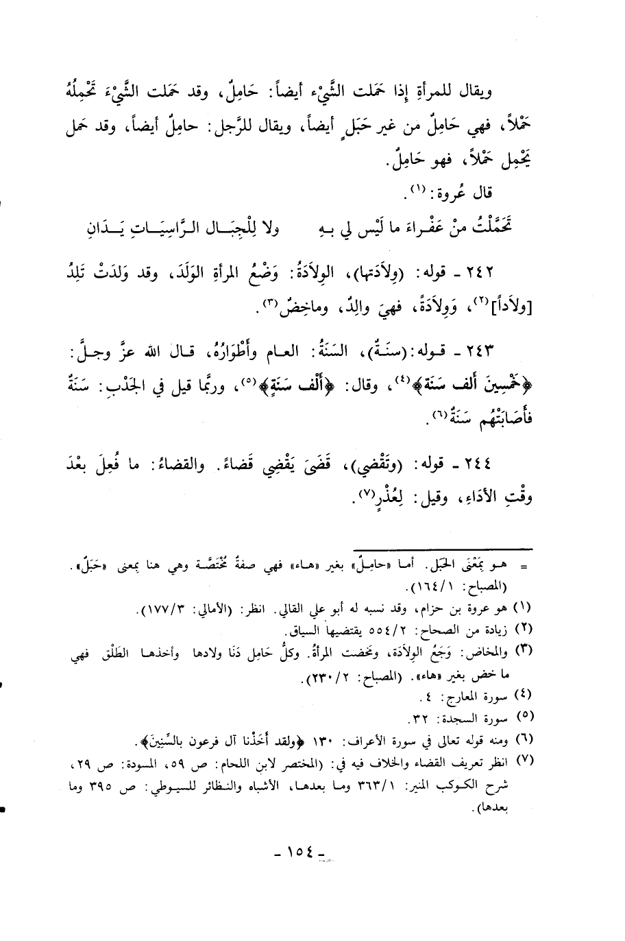 243 - قوله: (سنَةٌ)، السَنَةُ: العام وأَطْوَارُهُ، قال الله عزَّ وجلَّ: {خَمْسِينَ أَلْفَ سَنَةٍ} (¬4)، وقال: {أَلْفَ سَنَةٍ} (¬5)، وربَّما قيل في الجَدْبِ: سَنَةٌ فأَصَابَتْهُم سَنَةٌ (¬6).