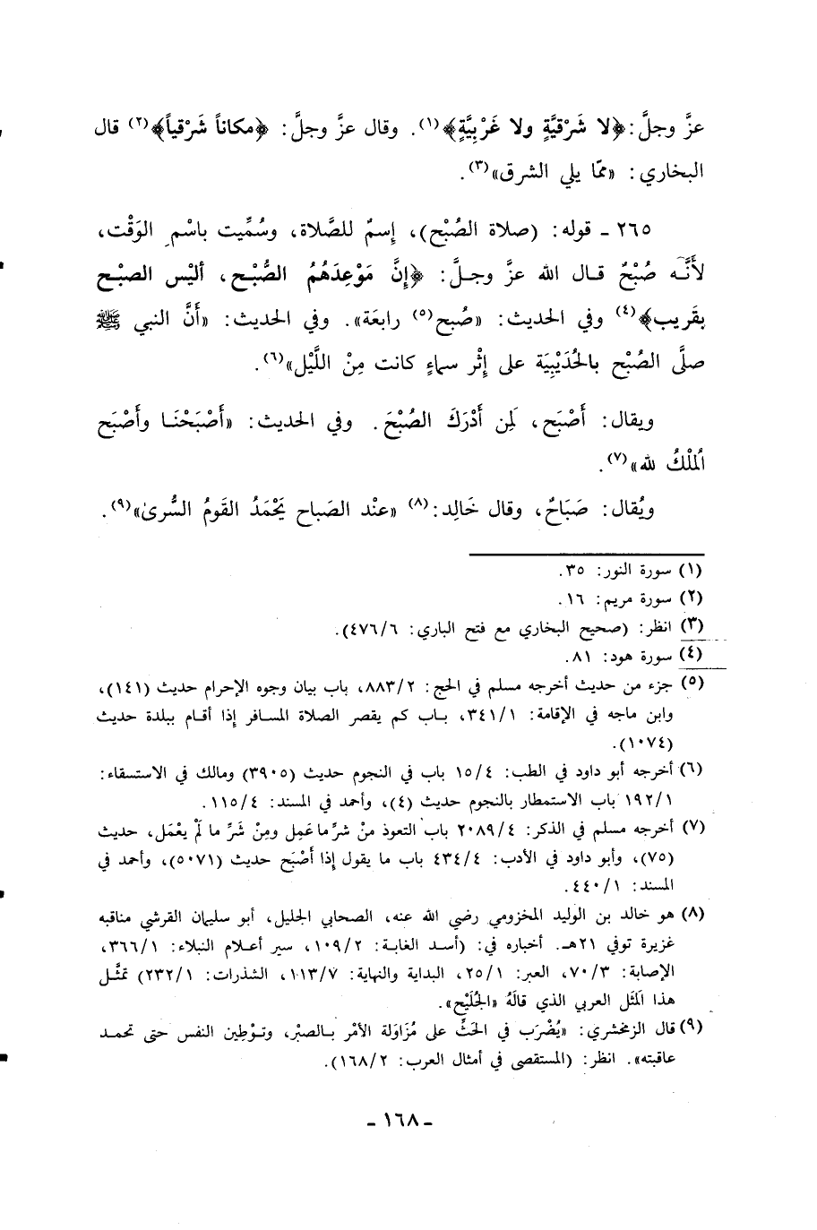 265 - قوله: (صلاة الصُبْح)، إِسمٌ للصَّلاة، وسُمِّيت باسْمِ الوَقْت، لأَنَّه صُبْحٌ قال الله عزَّ وجلَّ: {إِنَّ مَوْعِدَهُمُ الصُّبْحُ أَلَيْسَ الصُّبْحُ بِقَرِيبٍ} [هود: 81] (¬4) وفي الحديث: "صُبح (¬5) رابعَة". وفي الحديث: "أَنَّ النبي - صلى الله عليه وسلم - صلَّى الصُبْح بالحُدَيْبِيَة على إِثْر سماءٍ كانت مِنْ اللَّيْل" (¬6).
