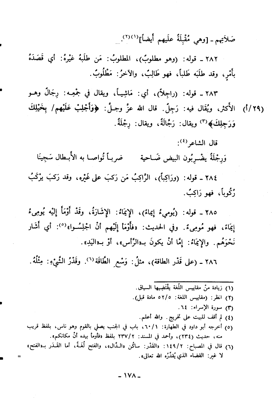 283 - قوله: (راجِلاً)، أي: مَاشِياً، ويقال في جمْعِه: رِجَالٌ وهو (29 أ) الأَكثر، ويُقَال فيه: رَجِلٌ. قال الله عزَّ وجلَّ: {وَأَجْلِبْ عَلَيْهِمْ بِخَيْلِكَ وَرَجِلِكَ} (¬3) ويقال: رَجَّالَةٌ، ويقال: رِجْلَة.
