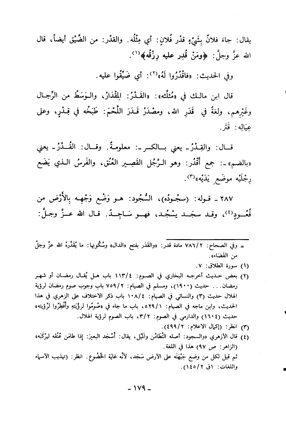 قال: والقِدْرُ - يعني بالكسر -: معلومةٌ. وقال: القُدْرُ - يعني "بالضم" -: جمع أقْدُر: وهو الرَّجُل القَصِير العُنُق، والفَرسُ الذي يَضَع رِجْلَيْه موضَعِ يَدَيْه" (¬3).