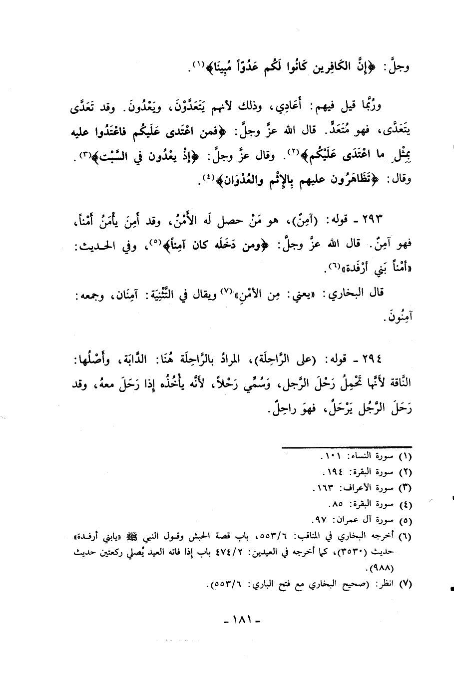 293 - قوله: (آمِن)، هو مَنْ حصل لَه الأمْنُ، وقد أمِنَ يأْمَنُ أمْناً، فهو آمِن. قال الله عزَّ وجلَّ: {وَمَنْ دَخَلَهُ كَانَ آمِنًا} (¬5)، وفي الحديث: "أمْناً بَني أرْفَدة" (¬6).