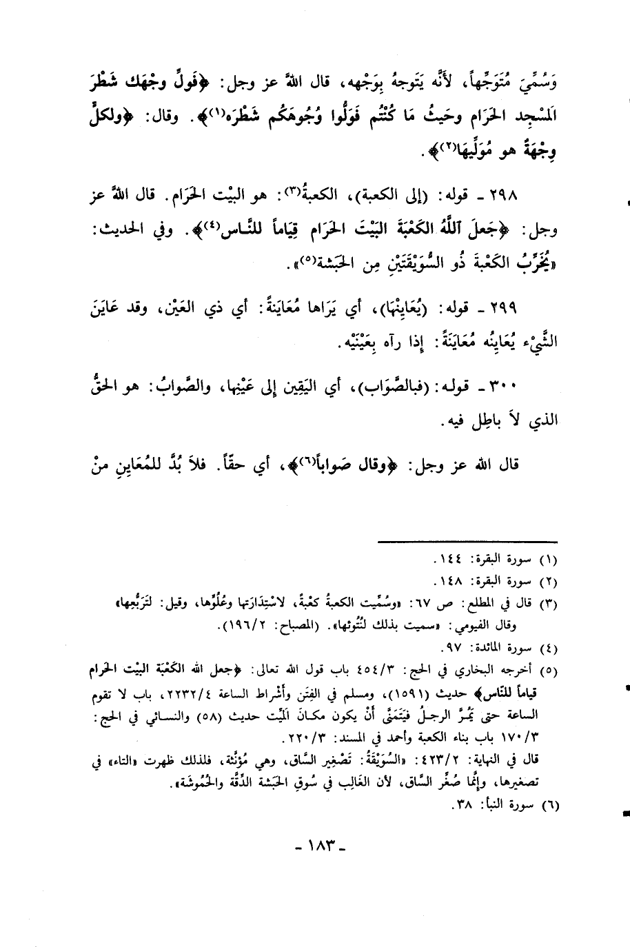 298 - قوله: (إلى الكعبة)، الكعبةُ (¬3): هو البيْت الحَرَام. قال الله عز وجل: {جَعَلَ اللَّهُ الْكَعْبَةَ الْبَيْتَ الْحَرَامَ قِيَامًا لِلنَّاسِ} (¬4). وفي الحديث: "يُخَرِّبُ الكَعْبةَ ذُو السُّويقَتَيْنِ مِن الحبَشة (¬5) ".