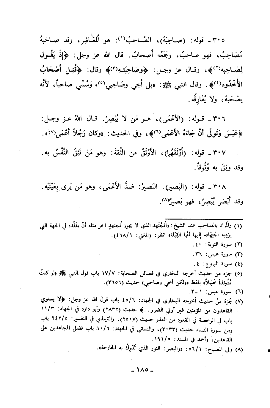 305 - قوله: (صاحِبَهُ)، الصَاحبُ (¬1): هو الُمعَاشِر، وقد صاحَبهُ مُصَاحِبٌ، فهو صاحبٌ، وجَمْعُه أصحابٌ. قال الله عز وجل: {إِذْ يَقُولُ لِصَاحِبِهِ} (¬2)، وقال عز وجل: {وَصَاحِبَتِهِ} (¬3) وقال: {قُتِلَ أَصْحَابُ الْأُخْدُودِ (¬4)}. وقال النبي - صلى الله عليه وسلم -: "بل أخِي وصَاحِبي (¬5) وَسُمَي صاحباً، لأَنَّه يصْحَبهُ، ولا يُفَارِقُه.