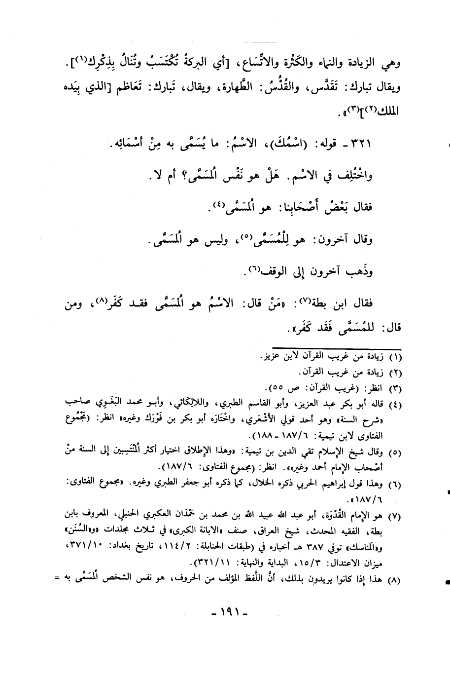 (¬4) قاله أبو بكر عبد العزيز، وأبو القاسم الطبري، واللالِكَائي، وأبو محمد البَغَوِي صاحب "شرح السنة" وهو أحد قولي الأشْعَري، واخْتَارَه أبو بكر بن فَوْرَك وغيره" انظر: (مَجْموع الفتاوى لابن تيمية: 6/ 187 - 188).