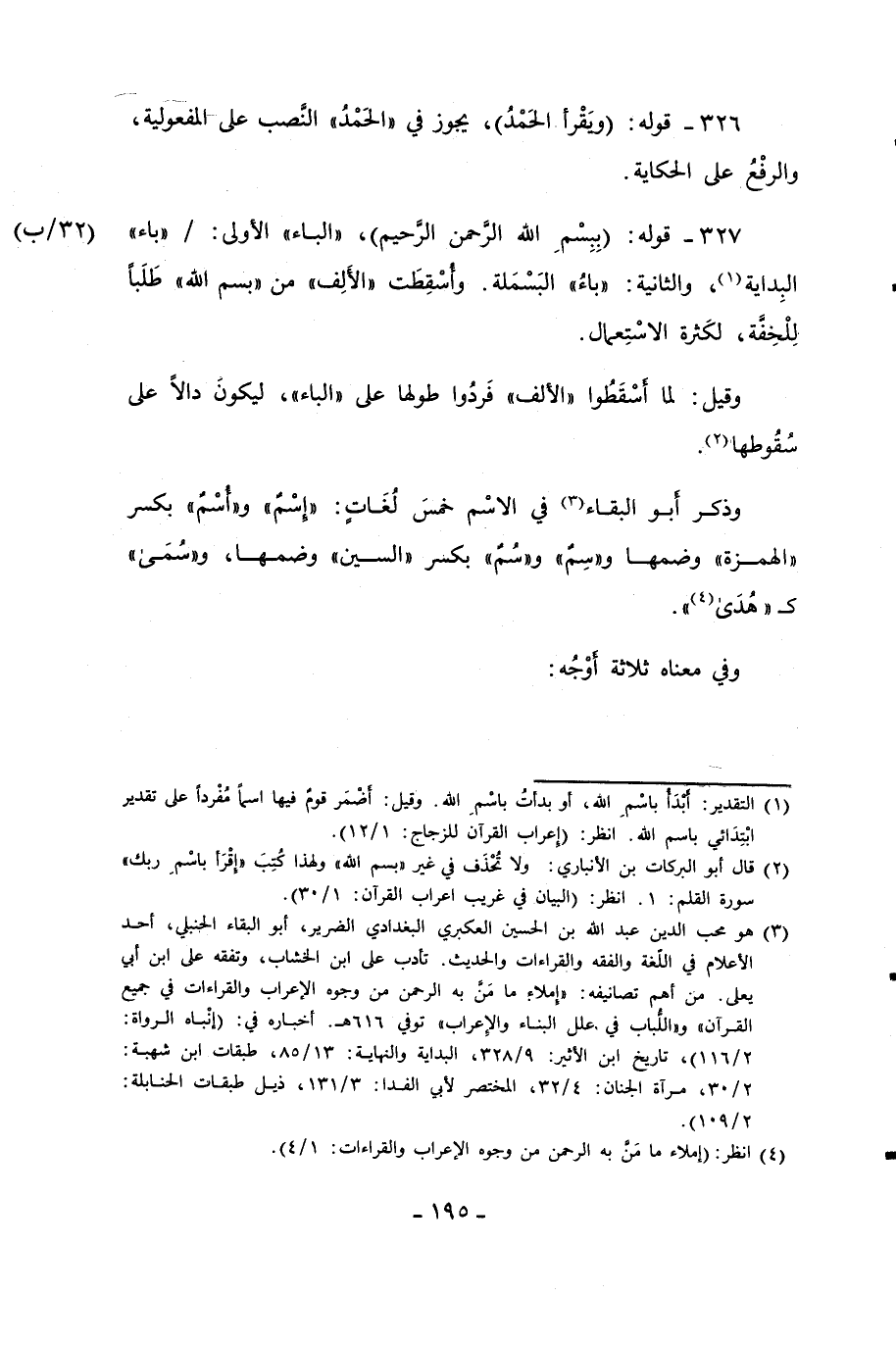 327 - قوله: (بِبِسْمِ الله الزَحمن الرَّحيم)، "الباء" الأولى: "باء" البِداية (¬1)، والثانية: "باءُ" البَسْمَلة. وأُسْقِطَت "الأَلِف" من "بسم الله" طَلَباً لِلْخِفَّة، لكَثرة الاسْتِعمال.