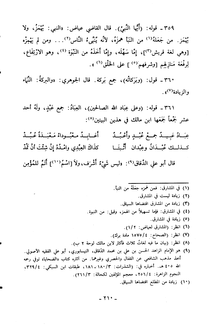 359 - قوله: (أيُّها النَّبيُ). قال القاضي عياض: "النبي: يُهْمَزُ، ولا يُهْمَز. من جَعَلهُ (¬1) من النَبَأ همزَهُ، لأنَّه يُنَبِّئُ النَّاس (¬2) ... ومن لم يَهْمِزْه [وهي لغة قريش (¬3)]، إمَّا سَهَّلَه، وإمَّا أخَذَهُ من النَبْوَة (¬4)، وهو الارْتِفَاع، لِرفْعَة مَنازِلِهِم [وشرفهمْ (¬5)] على الخَلْق (¬6) ".