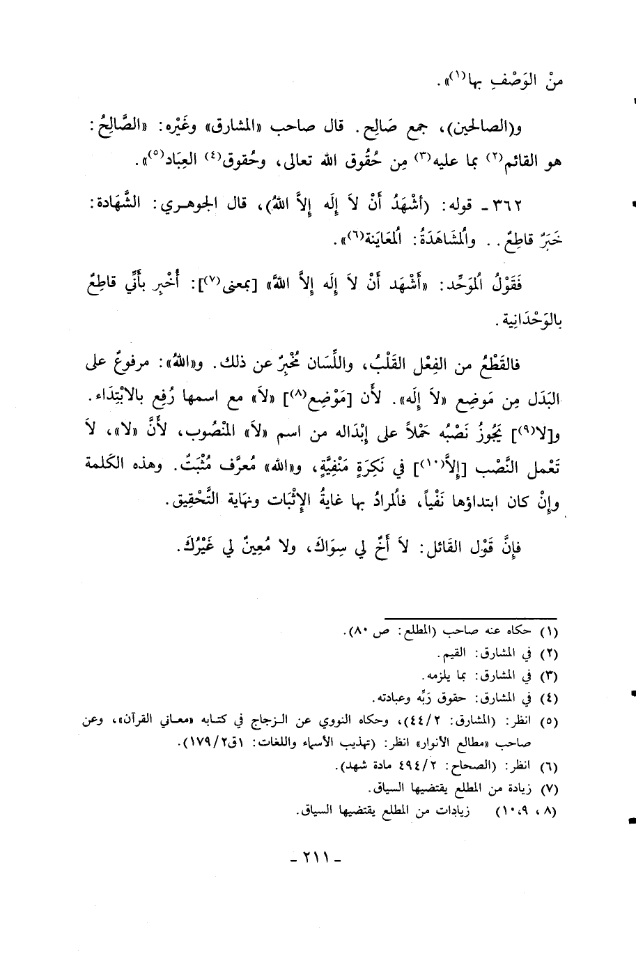 362 - قوله: (أشْهَدُ أنْ لاَ إِلَه إِلَّا الله)، قال الجوهري: الشَّهَادة: خَبَرٌ قاطِعٌ .. والمُشَاهَدَةُ: المُعَايَنة (¬6) ".