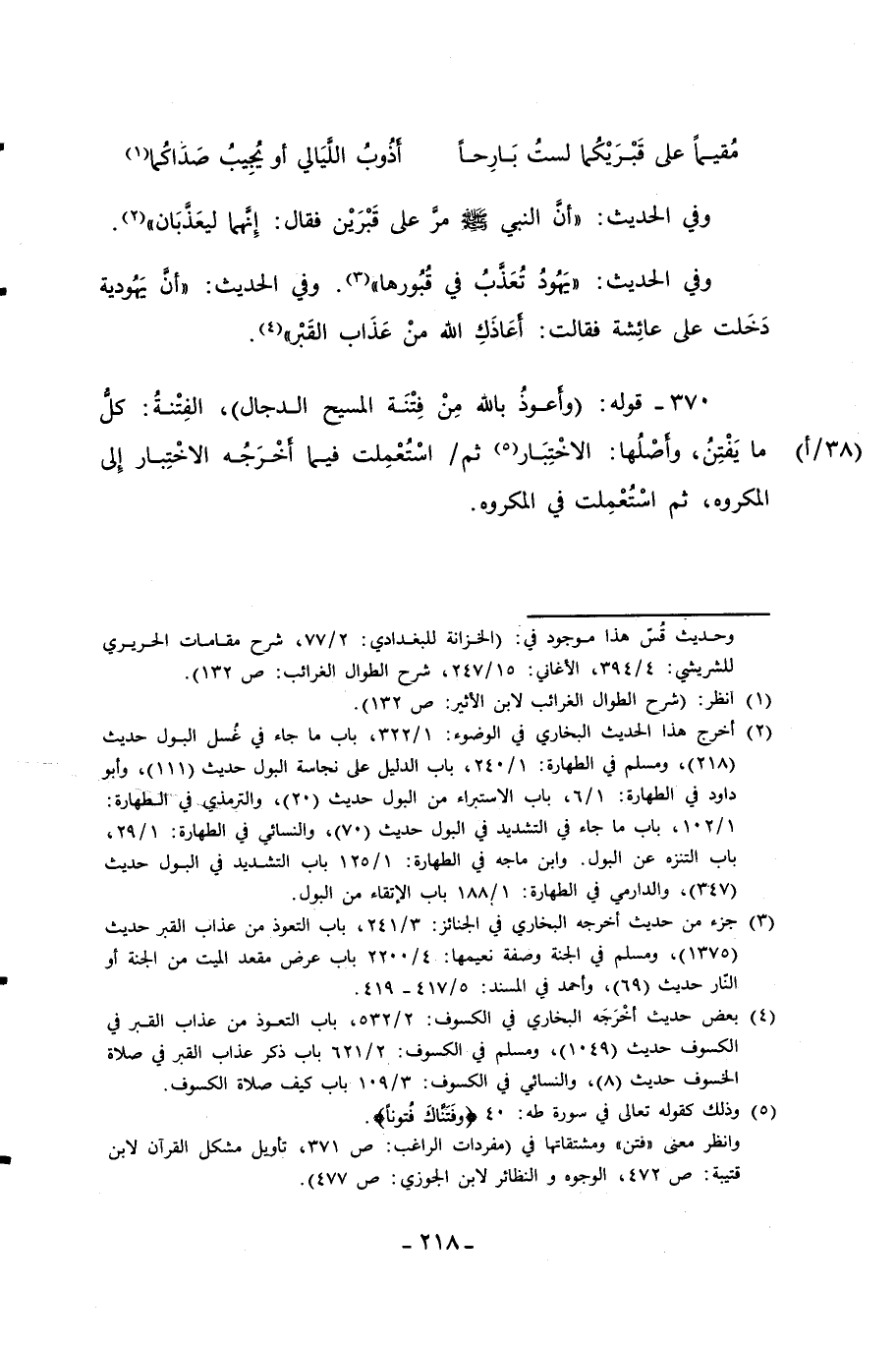(¬2) أخرج هذا الحديث البخاري في الوضوء: 1/ 322، باب ما جاء في غُسل البول حديث (218)، ومملم في الطهارة: 1/ 240، باب الدليل على نجاسة البول حديث (111)، وأبو داود في الطهارة: 1/ 6، باب الاستبراء من البول حديث (20)، والترمذي في الطهارة: 1/ 102، باب ما جاء في التشديد في البول حديث (70)، والنسائي في الطهارة: 1/ 29، باب التنزه عن البول. وابن ماجه في الطهارة: 1/ 125 باب التشديد في البول حديث (347)، والدارمي في الطهارة: 1/ 188 باب الإتقاء من البول.