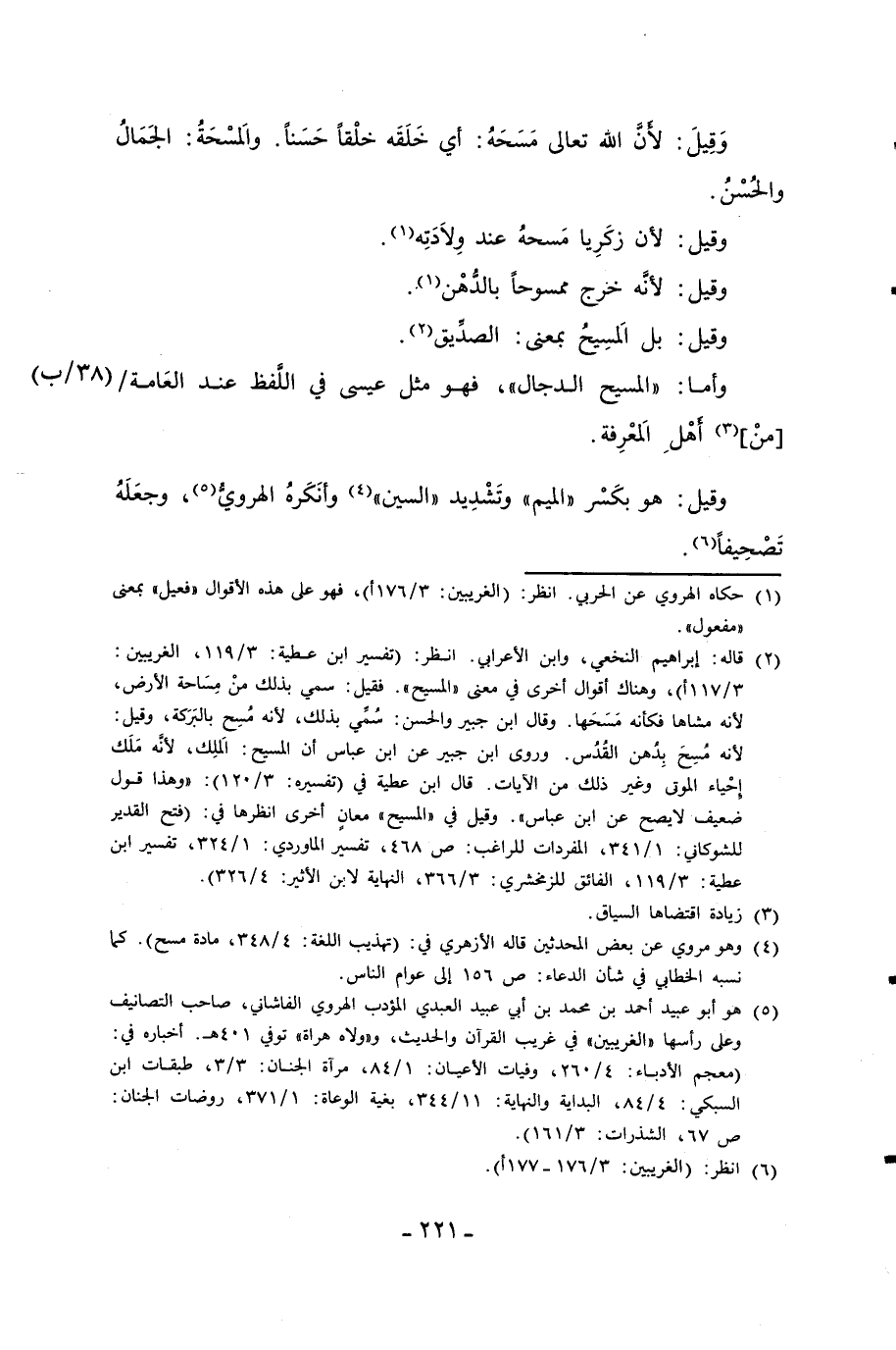 (¬2) قاله: إبراهيم النخعي، وابن الأعرابي. انظر: (تفسير ابن عطية: 3/ 119، الغريبين: 3/ 117 أ)، وهناك أقوال أخرى في معنى "المسيح". فقيل: سمي بذلك منْ مِسَاحة الأرض، لأنه مشاها فكأنه مَسَحَها. وقال ابن جبير والحسن: سُمِّي بذلك، لأنه مُسِح بالبَرَكة، وقيل: لأنه مُسِحَ بِدُهن القُدُس. وروى ابن جبير عن ابن عباس أن المسيح: الَملِك، لأنَّه مَلَك إحْياء الموتي وغير ذلك من الآيات. قال ابن عطية في (تفسيره: 3/ 120): "وهذا قول ضعيف لا يصح عن ابن عباس". وقيل في "المسيح" معانٍ أخرى انظرها في: (فتح القدير للشوكاني: 1/ 341، المفردات للراغب: ص 468، تفسير الماوردي: 1/ 324، تفسير ابن عطية: 3/ 119، الفائق للزمخشري: 3/ 366، النهاية لابن الأثير: 4/ 326).