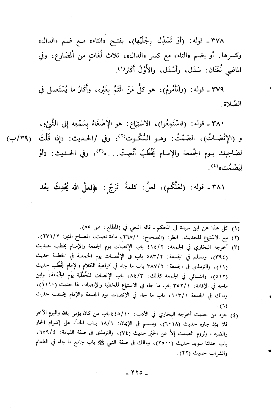 380 - قوله: (فاسْتَمِعُوا)، الاسْتِمَاع: هو الإِصْغَاءُ بِسَمْعِه إِلى الشَّيْءِ، و (الإِنْصَاتُ)، الصَمْت: وهو السُّكُوت (¬2)، وفي الحديث: "إِذا قُلْتَ لصَاحِبِك يوم الجُمعة والإِمام يَخْطبُ أَنْصِتْ ... " (¬3)، وفي الحديث: "أوْ لِيَصْمُت" (¬4).