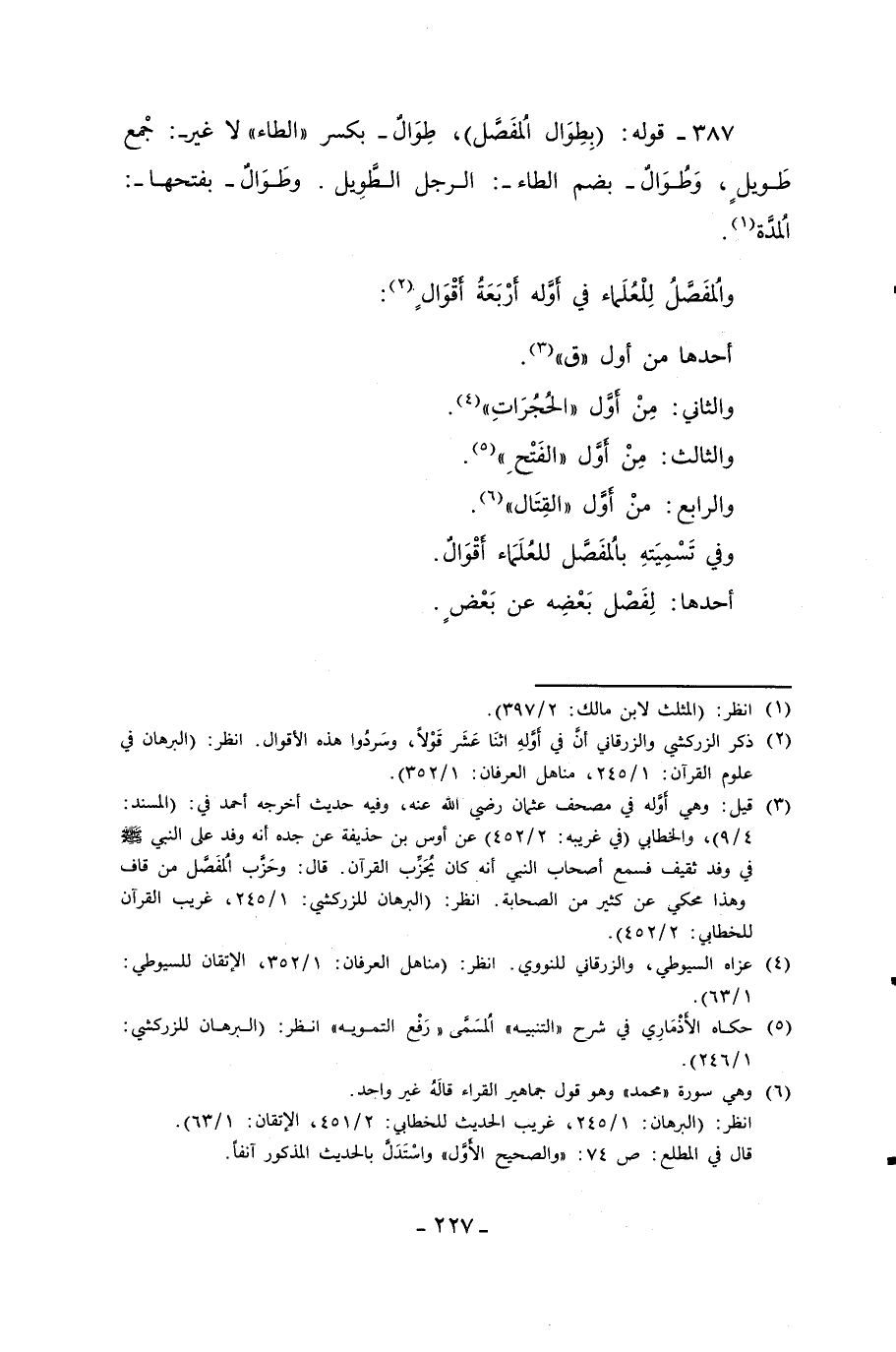 387 - قوله: (بِطِوَال الُمفَصَّل)، طِوَالٌ -بكسر "الطاء" لا غير-: جمْع طَويلٍ، وَطُوَالٌ -بضم الطاء-: الرجل الطَّويل. وطَوَالٌ -بفتحها-: المُدَّة (¬1).