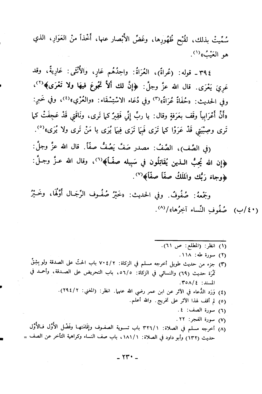 394 - قوله: (عُراةٌ)، العُرَاةُ: واحِدُهُم عَارٍ، والأُنْثَى: عَارِيةٌ، وقد عَرِيَ يَعْرَى. قال الله عزَّ وجلَّ: {إِنَّ لَكَ أَلَّا تَجُوعَ فِيهَا وَلَا تَعْرَى} (¬2)، وفي الحديث: "حُفَاةٌ عُرَاةٌ" (¬3) وفي دُعَاء الاسْتِسْقَاء: "والعُرْي" (¬4)، وفي خَبرٍ: "أَنَّ أعْرَابِيًا وقَف بعَرَفةٍ وقال: يا ربِّ إِنِّي فَقِيرٌ كما تَرى، ونَاقَتِي قَدْ عَجِفَتْ كما تَرى وصِبْيَتِي قَدْ عَرَوْا كما تَرَى فَبِمَا تَرَى فِيمَا يُرَى يا مَنْ تَرى ولا يُرَى" (¬5).