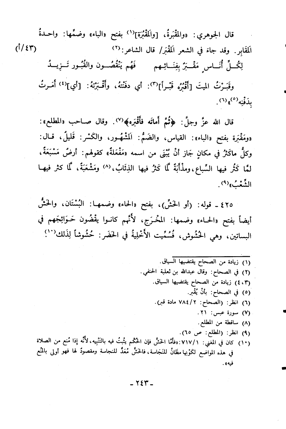 425 - قوله: (أو الحَشِّ)، بفتح "الحاء" وضمها: البُسْتَان، والحَشُّ أيضًا بفتح "الحاء" وضمها: المخْرَج، لأنَّهم كانوا يقْضُون حَوَائِجَهم في البساتين، وهي الحُشُوش، فُسُمِّيت الأَخْلِيةُ في الحَضَر: حُشُوشًا لِذَلك (¬10).
