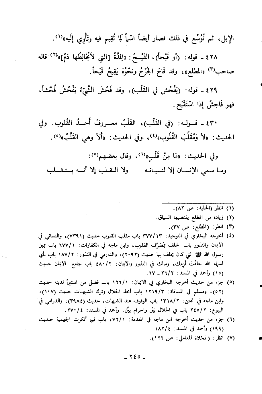 430 - قوله: (في القَلْب)، القَلْبُ معروفٌ أَحدُ القُلوب. وفي الحديث: "لاَ وَمُقَلِّبَ القُلُوب" (¬4)، وفي الحديث: "ألاَ وهي القَلْبُ" (¬5).