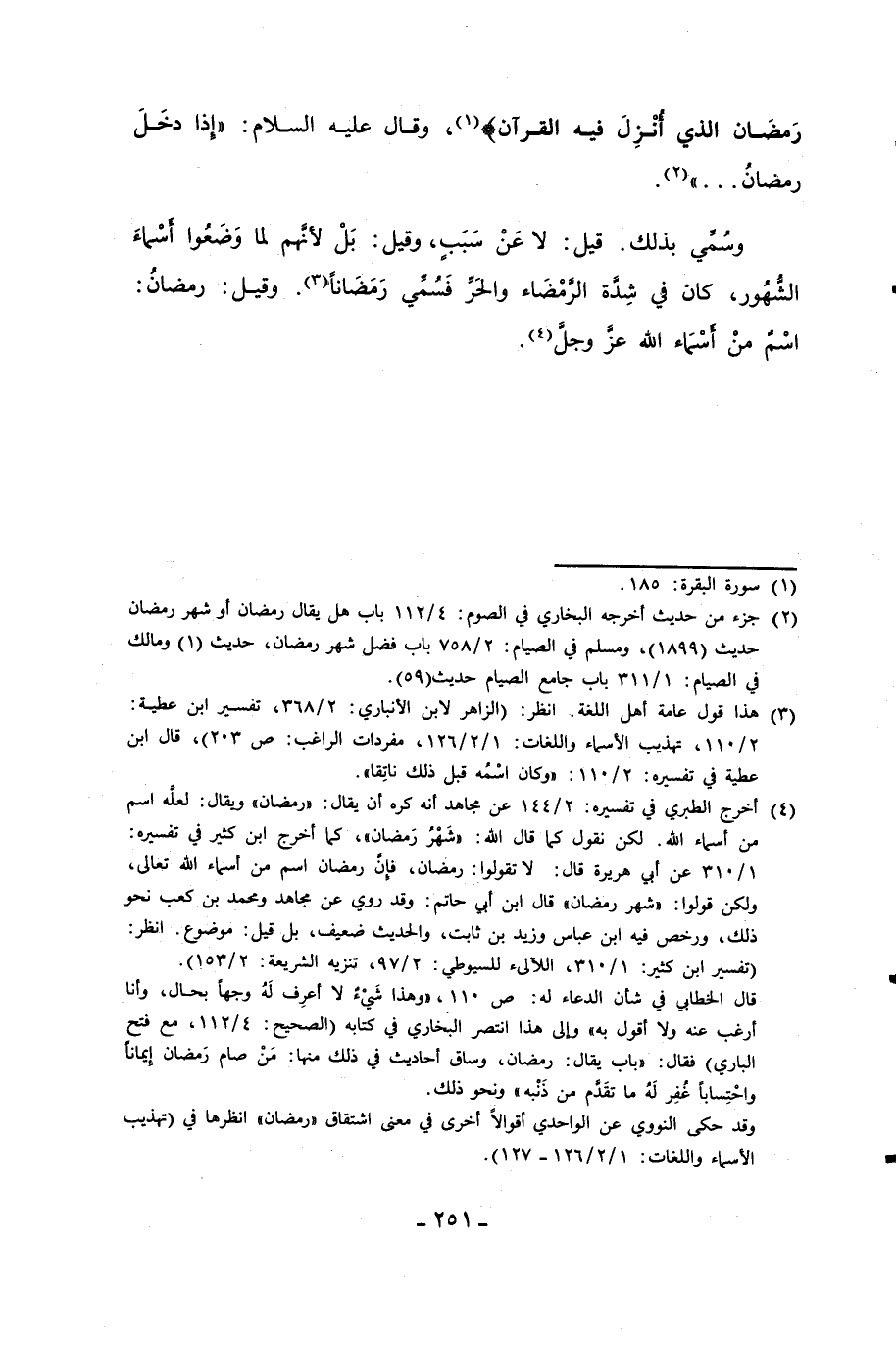(¬4) أخرج الطبري في تفسيره: 2/ 144 عن مجاهد أنه كره أن يقال: "رمضان" ويقال: لعله اسم من أسماء الله. لكن نقول كما قال الله: "شَهْرُ رَمضان"، كما أخرج ابن كثير في تفسيره: 1/ 310 عن أبي هريرة قال: لا تقولوا: رمضان، فإنَّ رمضان اسم من أسماء الله تعالى، ولكن قولوا: "شهر رمضان" قال ابن أبي حاتم: وقد روي عن مجاهد ومحمد بن كعب نحو ذلك، ورخص فيه ابن عباس وزيد بن ثابت، والحديث ضعيف، بل قيل: موضوع. انظر: (تفسير ابن كثير: 1/ 310، اللآلئ للسيوطي: 2/ 97، تنزيه الشريعة: 2/ 153).