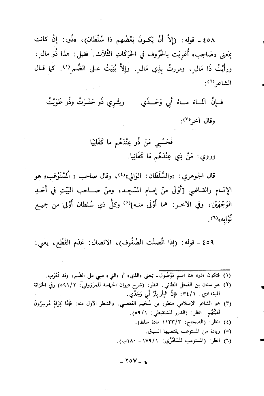 458 - قوله: (إِلَّا أنْ يَكونَ بَعْضُهم ذا سُلْطَان)، "ذُو": إِنْ كانت بِمَعنى "صَاحِب" أُعْرِبَت بالحُرُوف في الحَرَكَاتِ الثَّلاَث. فقيل: هذا ذُوَ مالٍ، ورأَيْتُ ذَا مَالٍ، ومررتُ بِذِي مَالٍ. وإلَّا بُنِيَتْ على الضَّمِ (¬1). كما قال الشاعر (¬2):