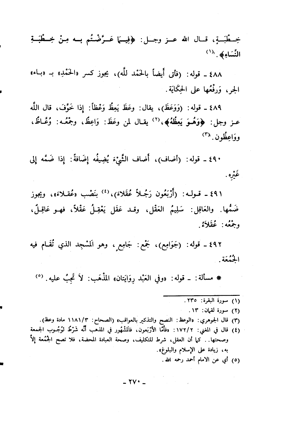 491 - قوله: (أَرْبَعُون رَجُلًا عُقَلاءَ)، (¬4) بنَصْب "عُقلاءَ"، ويجوز ضَمُّها. والعَاقِل: سَلِيمُ العَقْل، وقد عَقَل يَعْقِلُ عَقْلًا، فهو عَاقِلٌ، وجمْعُه: عُقَلاَءُ