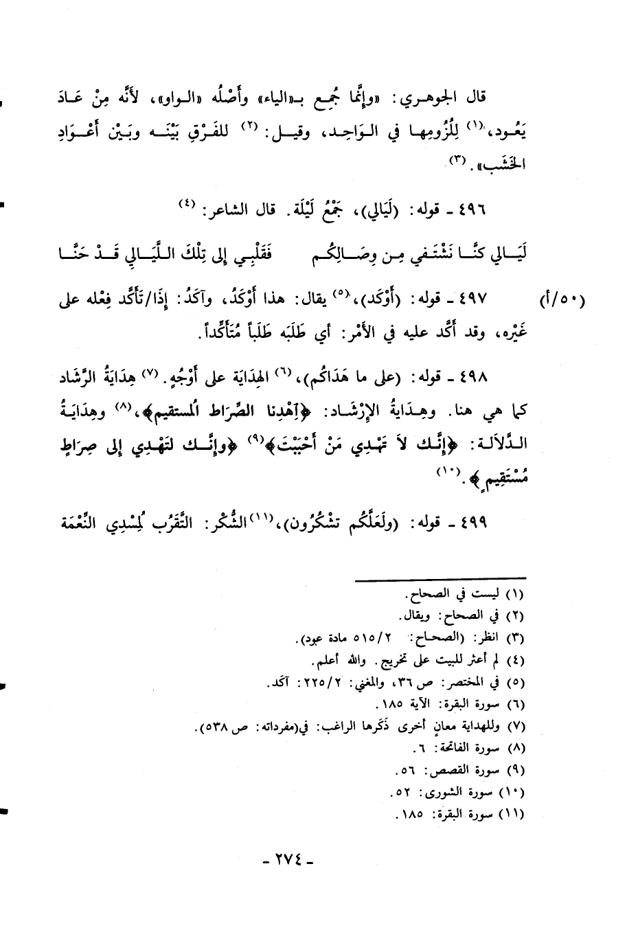 498 - قوله: (على ما هَدَاكُم)، (¬6) الهِدَايَة على أَوْجُهٍ. (¬7) هِدَايَةُ الرَّشَاد كما هي هنا. وهِدَايةُ الإِرْشَاد: {اهْدِنَا الصِّرَاطَ الْمُسْتَقِيمَ}، (¬8) وهِدَايَةُ الدَّلاَلة: {إِنَّكَ لَا تَهْدِي مَنْ أَحْبَبْتَ} (¬9) {وَإِنَّكَ لَتَهْدِي إِلَى صِرَاطٍ مُسْتَقِيمٍ}. (¬10)
