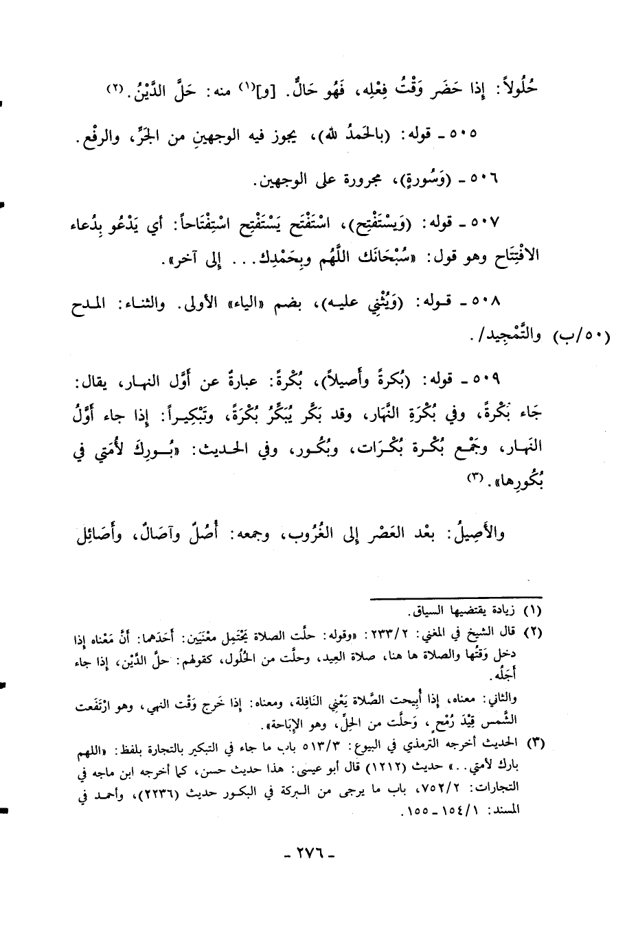 (¬2) قال الشيخ في المغني: 2/ 233: "وقوله: حلَّت الصلاة يَحْتَمِل معْنَيَين: أَحَدَهما: أَنَّ مَعْناه إِذا دخل وَقتُها والصلاة ها هنا، صلاة العِيد، وحلَّت من الحُلُول، كقولهم: حلَّ الدَّيْن، إِذا جاء أَجَلُه.