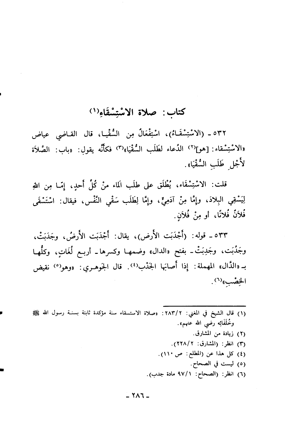 532 - (الاسْتِسْقَاءُ)، اسْتِفْعَالٌ مِن السُّقْيا، قال القاضي عياض "الاسْتِسْقاء: [هو] (¬2) الدُعاء لطَلَب السُّقْيَا" (¬3) فكأنه يقول: "باب: الصَّلاَة لأجْلِ طَلَبِ السُّقْيَا".