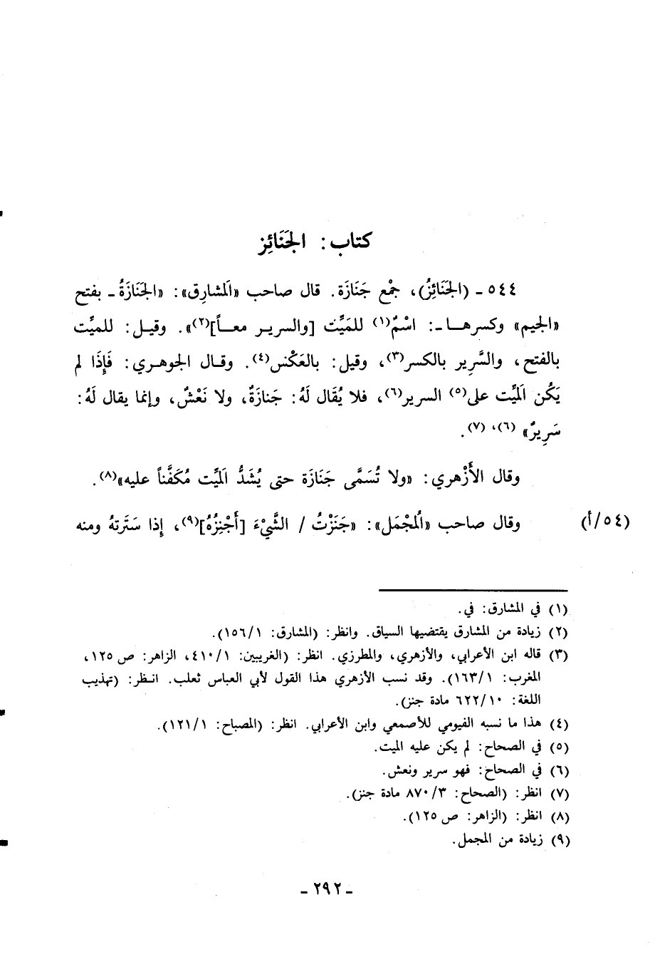 544 - (الجَنَائِزُ)، جمْع جَنَازَة. قال صاحب "الَمشارِق": " الجَنَازَةُ - بفتح "الجيم" وكسرها -: اسْمٌ (¬1) للمَيِّت [والسرير معاً] (¬2) ". وقيل: للميِّت بالفتح، والسَّرِير بالكسر (¬3)، وقيل: بالعَكْس (¬4). وقال الجوهري: فَإِذَا لم يَكُن الَمئت على (¬5) السرير (¬6)، فلا يُقَال لَهُ: جَنازَة، ولا نَعْشٌ، وإنما يقال لَهُ: سَرِيرٌ" (6)، (¬7).