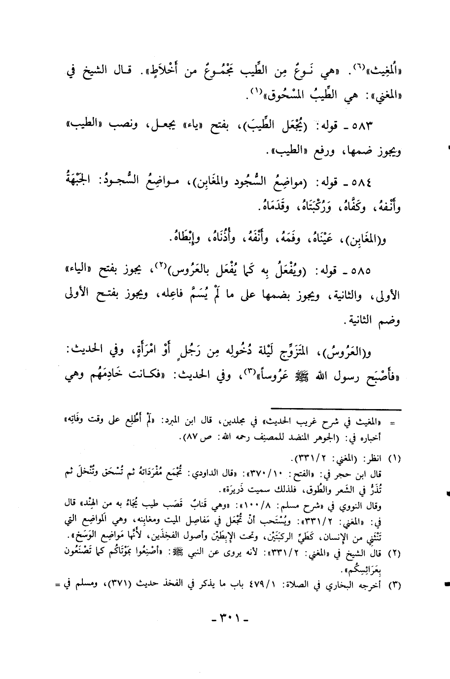 585 - قوله: (ويُفْعَلُ بِه كَما يُفْعَل بالعَرُوس) (¬2)، يجوز بفتح "الياء" الأولى، والثانية، ويجوز بضمها على ما لَمْ يُسَمَّ فاعِله، ويجوز بفتح الأولى وضم الثانية.
